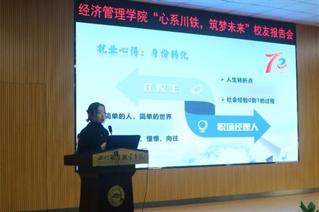 七十载桃李芬芳,薪火传再续辉煌。为宣传优秀校友成长成才事迹,激励在校学生自强不息、奋发成才,11月11日下午,经济管理学院在学校学术报告厅举办了主题为“心系川铁,筑梦未来”的优秀校友报告会。
