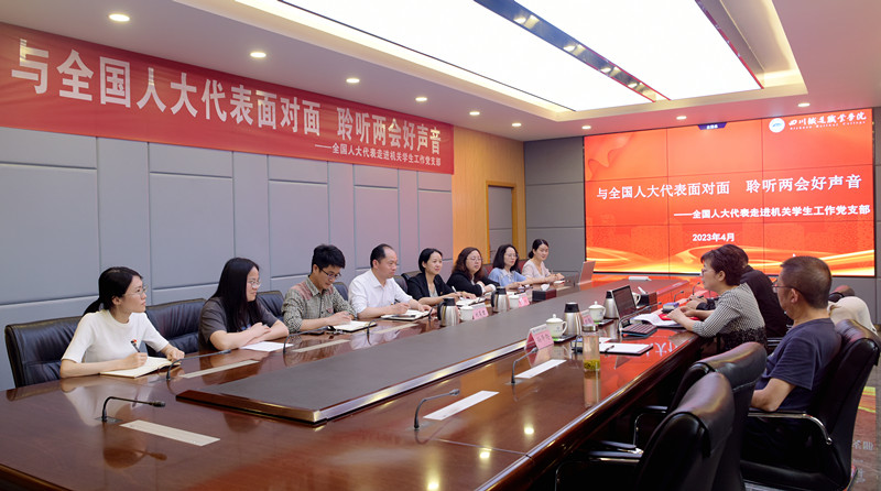 为深入学习贯彻习近平总书记在全国两会期间重要讲话精神和全国两会精神,4月17日下午,机关学生工作党支部开展“与全国人大代表面对面 聆听两会好声音”党日活动。本次活动邀请到十四届全国人大代表、眉山市青神中学副校长王晓梅到校交流。此次主题党日由机关学生工作党支部书记朱俐同志主持,党委副书记刘昊君以普通党员身份参加活动。