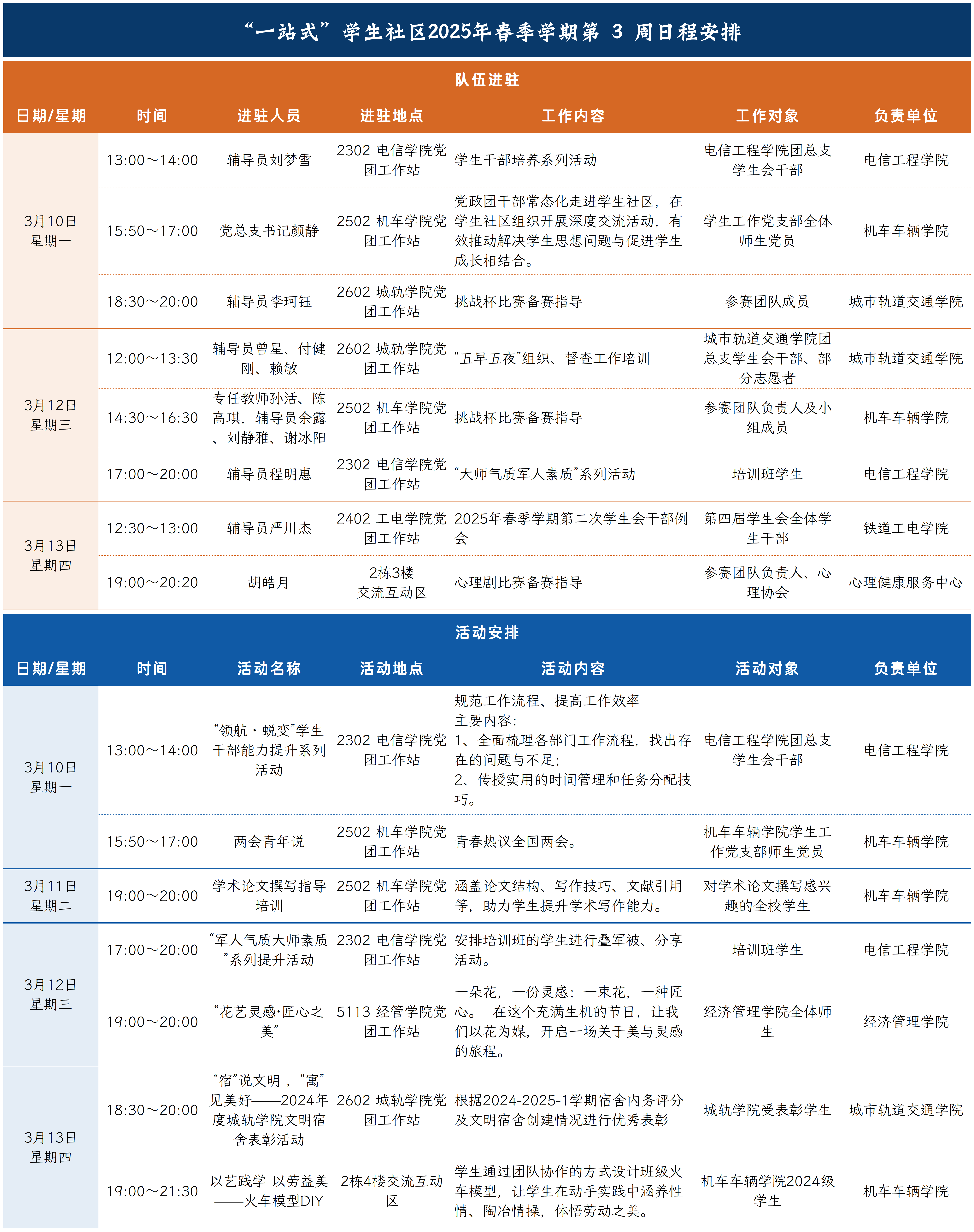 “一站式”学生社区2025年春季学期第3周日程安排