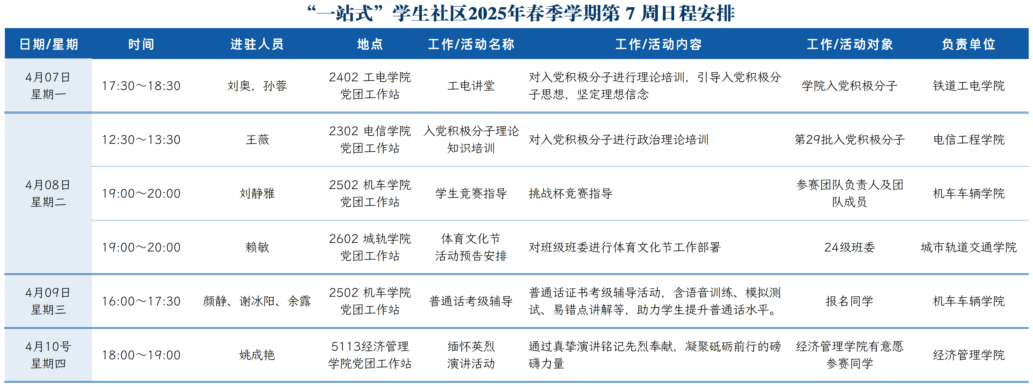 “一站式”学生社区2025年春季学期第7周日程安排