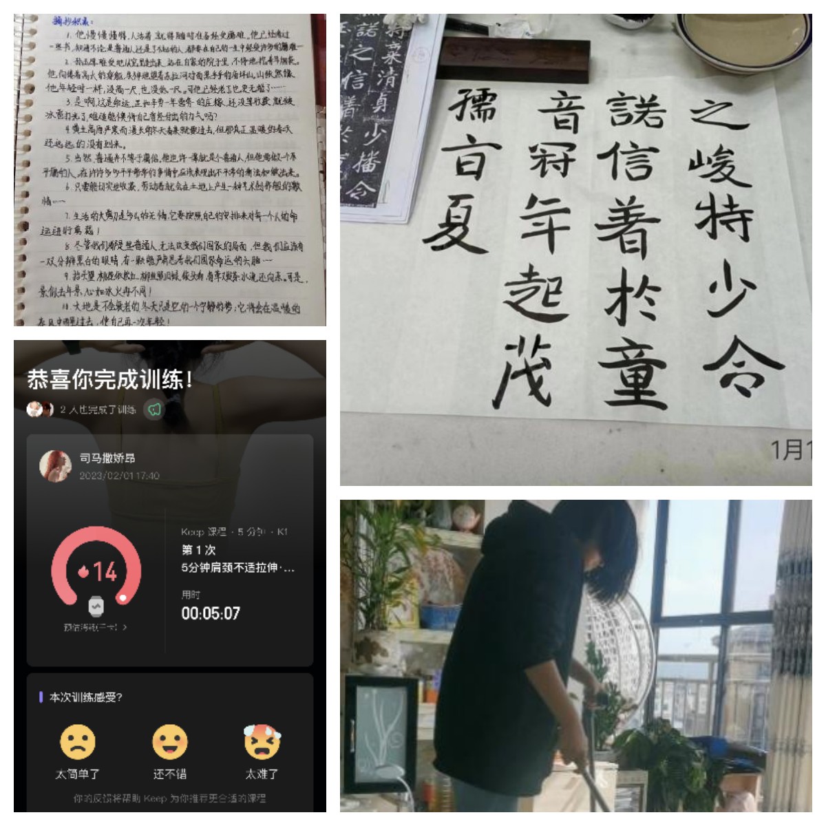 三是励学成长寒假打卡活动。学校引导学生结合个人兴趣爱好和实际,积极参与“励学成长寒假打卡”活动,在经典书目阅读中汲取知识养分、在运动健身锻炼中强健个人体魄、在才艺磨练学习中发掘自我潜力、在家务劳作体验中感受劳动魅力。建立“打卡”圈子,借助“打卡结果共享”的方式在学院范围内形成良好氛围,激励学生良性竞争、不断进步。据统计,全校共30名同学在此学习实践活动中获评“寒假加油站”励学成长打卡一、二、三等奖。