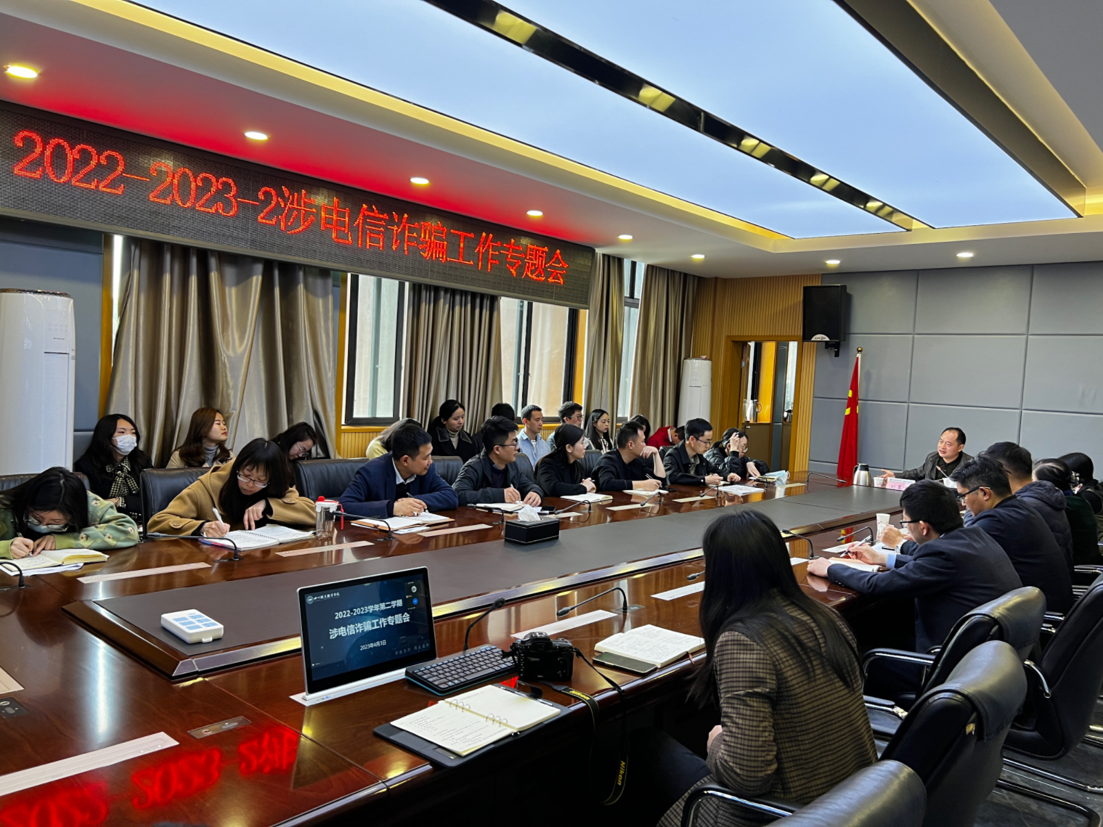 为加强平安校园建设,提高广大师生识骗、防骗能力,遏制学生涉电信网络诈骗案件的发生,4月3日上午,学校在第五会议室召开学生群体涉电信诈骗专题会议,深入分析了当前面临的严峻形势,对下一步工作进行了安排部署。会议由党委副书记刘昊君主持。