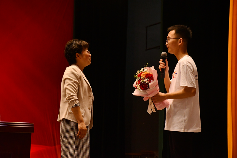 报告结束后,学生代表雷云杰(原青神中学毕业生)向王晓梅校长献花
