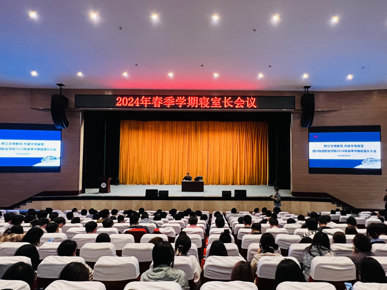 为深入推进“一站式”学生社区建设,充分发挥社区寝室长作用,共建安全、文明、和谐、温馨的公寓环境,培育良好校风学风,4月1日下午,学生处学生科在成都校区大礼堂召开2024年春季学期寝室长会议,学生处相关人员,全体专职辅导员,2020级(高职)、2022级、2023级全体寝室长1000余人参加会议。