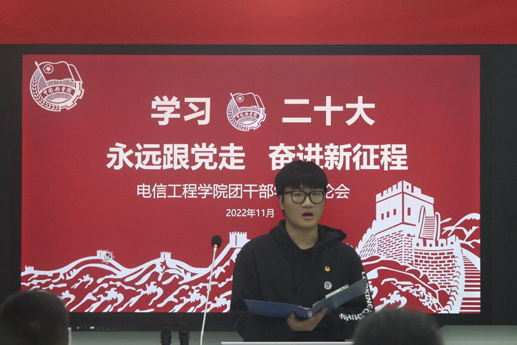 2022年10月16日上午,中国共产党第二十次全国代表大会在北京人民大会堂隆重开幕。党的二十大是在全党全国各族人民迈上全面建设社会主义现代化国家新征程、向第二个百年奋斗目标进军的关键时刻召开的一次十分重要的大会。习近平总书记向大会作了报告,这份报告凝聚了全党智慧,制定了全党全国各族人民下一步的行动纲领和大政方针。为深入学习贯彻落实党的二十大精神,坚定不移听党话、跟党走,帮助团学干部立志做有理想敢担当能吃苦肯奋斗的新时代好青年,电信工程学院组织全院团学干部于11月8日在1209教室召开了“学习二十大 永远跟党走 奋进新征程”学习研讨会。会议由学院团总支书记唐宁晓老师主持。 本次研讨会分为两个部分,第一部分唐宁晓老师分别从党的二十大报告重要论述以及“五个牢牢把握”两个方面带领团学干部学习党的二十大会议精神。讲清楚了目前中国共产党的中心任务是团结带领全国各族人民全面建设社会主义现代化强国、实现第二个百年奋斗目标,以中国式现代化全面推进中华民族伟大复兴。唐宁晓老师要求全部团学干部要牢记五个“必由之路”,理解“五个牢牢把握”,立志做有理想敢担当能吃苦肯奋斗的新时代好青年。 第二部分由学院团总支副书记杨梓晨、团支部书记代表梁雨玥、刘定祎、赵梓涵做学习二十大精神的分享发言。杨梓晨分享到:“我们是幸运的一代人,身在红旗下,长在春风里,我们没有经历战火的摧残,也没有经历改革开放初期的艰辛。但我们身在先辈的余荫下,理应不忘初心,牢记使命,树立远大的理想和抱负,将人生理想融入国家和民族的事业中,在不懈奋斗中实现自己的人生价值。作为新时代的一名青年学子,理应勇做走在时代前面的奋进者、开拓者、奉献者,努力使自己成为祖国建设的有用之才、栋梁之材,为实现中国梦奉献智慧和力量。”梁雨玥说到:“党的二十大胜利召开,事关党和国家事业继往开来,事关中国特色社会主义前途命运,事关中华民族伟大复兴。我怀着激动的心情观看了二十大直播,看到党所做出的一系列为民大事要事,以及我国所取得的一系列重大成就,我感到无比骄傲和自豪!” 毛泽东同志为陕北公学成立题词时说:“要造就一大批人,这些人是革命的先锋队。这些人具有政治远见。这些人充满着斗争精神和牺牲精神。”通过此次学习讨论会,电信工程学院的团学干部们纷纷表示,新时代的团员青年们如初升的朝阳,不断积聚着能量,青年们会把党和国家的希望扛在肩上,终有一刻要把自己的青春和热血撒满祖国大地,在实现中华民族伟大复兴的征程上贡献青春力量。