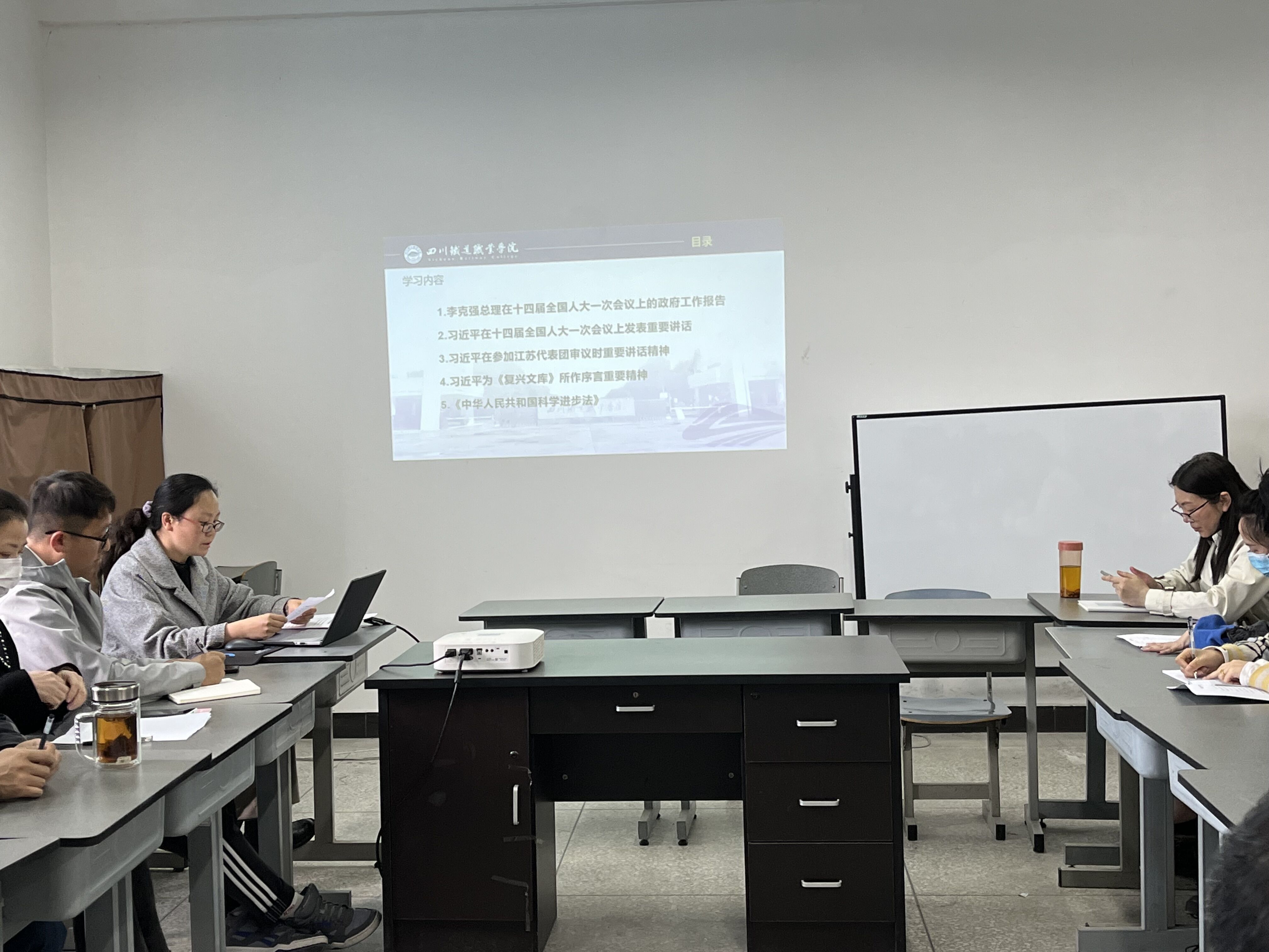 为深入学习贯彻党的二十大精神,根据中共四川省委宣传部和中共四川省委组织部对高校政治学习重点内容相关要求,结合学校党委组织部安排,4月3日,公共教学部于2501教室开展4月政治理论学习。组织部副部长姚思奇参与了学习活动。会议由公教部党支部书记刘媛主持。 会上,公共教学部教师陈丽、何燕、龙军、汪辉、韩鹏以及公教部党支部书记刘媛领学了李克强总理在十四届全国人大一次会议上的政府工作报告、习近平在十四届全国人大一次会议上发表重要讲话、习近平在参加江苏代表团审议时重要讲话精神、习近平为《复兴文库》所作序言重要精神和《中华人民共和国科学进步法》,展开讨论交流,阐述精神内涵和价值意义,结合文件精神探讨如何立足教师工作岗位而履行职责使命。刘媛同志指出,要深入贯彻以习近平同志为核心的党中央决策部署,强调认真学习李克强总理在十四届全国人大一次会议上的政府工作报告等精神的重要意义,希望教师们凝聚智慧,汲取力量,坚持人民至上,加强数字化技术和教育教学的深度融合,铭记“以史为鉴察往知来,在复兴之路上坚定前行”。 公共教学部副主任傅永华结合《教育部等八部门关于印发<全国青少年学生读书行动实施方案>的通知》,组织部门教师重点学习《全国青少年学生读书行动实施方案》的总体要求、丰富学生读书内容、创新读书行动载体、健全读书长效机制、认真做好组织实施等五个方面,谈到青少年学生爱读书、读好书、善读书,能增强历史自觉和文化自信,增强学生为中华民族伟大复兴而读书的责任感和使命感,强调青少年学生读书行动对学生成长发展、落实党的二十大精神、培养德智体美劳全面发展的社会主义建设者和接班人具有重要意义。他强调,教师们要将读书精神融入到教研活动和课堂教学中,以具体措施来落实文件精神,培养终身阅读的意识,将读书精神贯穿“三全育人”过程中,落实立德树人的根本任务。 姚思奇在发言中表示,希望公教部教师更加积极主动参与,以问题为导向,深入开展学习交流,提出问题、分析问题、解决问题,更好地开展教学科研工作。同时,要以党建为引领,坚持“党建+业务”的融合,思维发散,集思广益,提纲挈领,凝练成果,力求水到渠成、收放自如,凝心聚力谋发展。 图1 公共教学部副主任傅永华组织部门教师学习 图2 公教部党支部书记刘媛组织部门教师学习 图3 公共教学部全体教师参加政治理论学习 撰稿:杨健 审稿:傅永华、刘媛 |