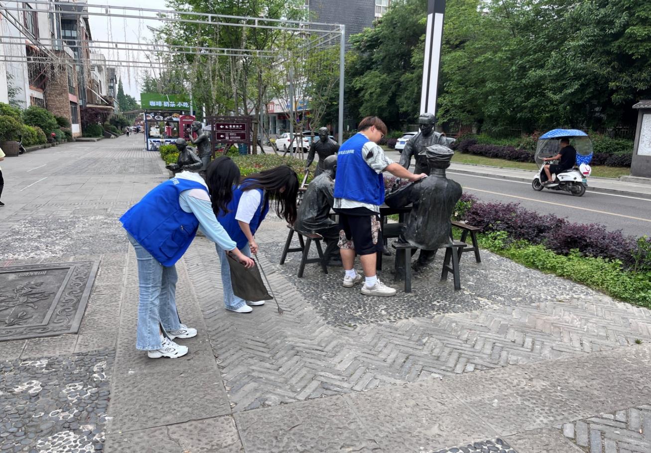 五四的青春号角还在耳边萦绕,青春的梦想还在远方,但始终根植于脚下的土壤。安德作为中国川菜文化城,具有丰富的川菜文化印记。本次活动以安德川菜文化体验街为中心,将安德步行街道上的雕像、街面作为清洁目标。活动过程中,同学们自觉分配任务,撸起袖子,不怕脏,不怕累,发扬吃苦耐劳的劳动精神,圆满完成工作任务。同学们在亲历劳动的过程中接受锻炼,磨炼意志、强化责任。