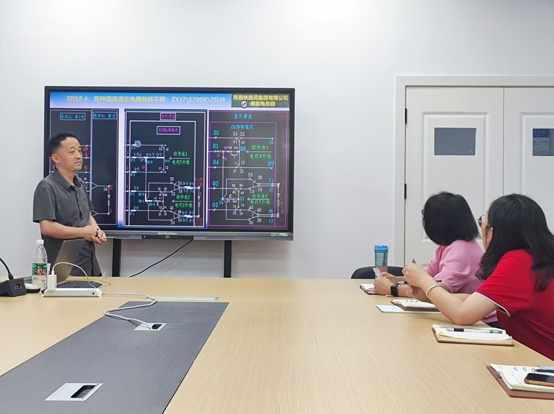 陈细华向全体老师介绍了提速道岔新电路原理以及电路图中动作线和电机外挂的新概念,重点对ZDJ9、ZYJ7、S700K三种类型的电路优化进行展示。他结合现场职工培训和技术比武方面的经验,提出了一些有创意的教学方法,为老师们提供了教学思路。教师们纷纷表示要将新思想、新理念、新技术融入课堂,以产教融合为导向,做好专业建设和课程优化。信号教研室老师进行交流发言,围绕教学中的困惑和心得,共同探讨教学方法的改进与创新。