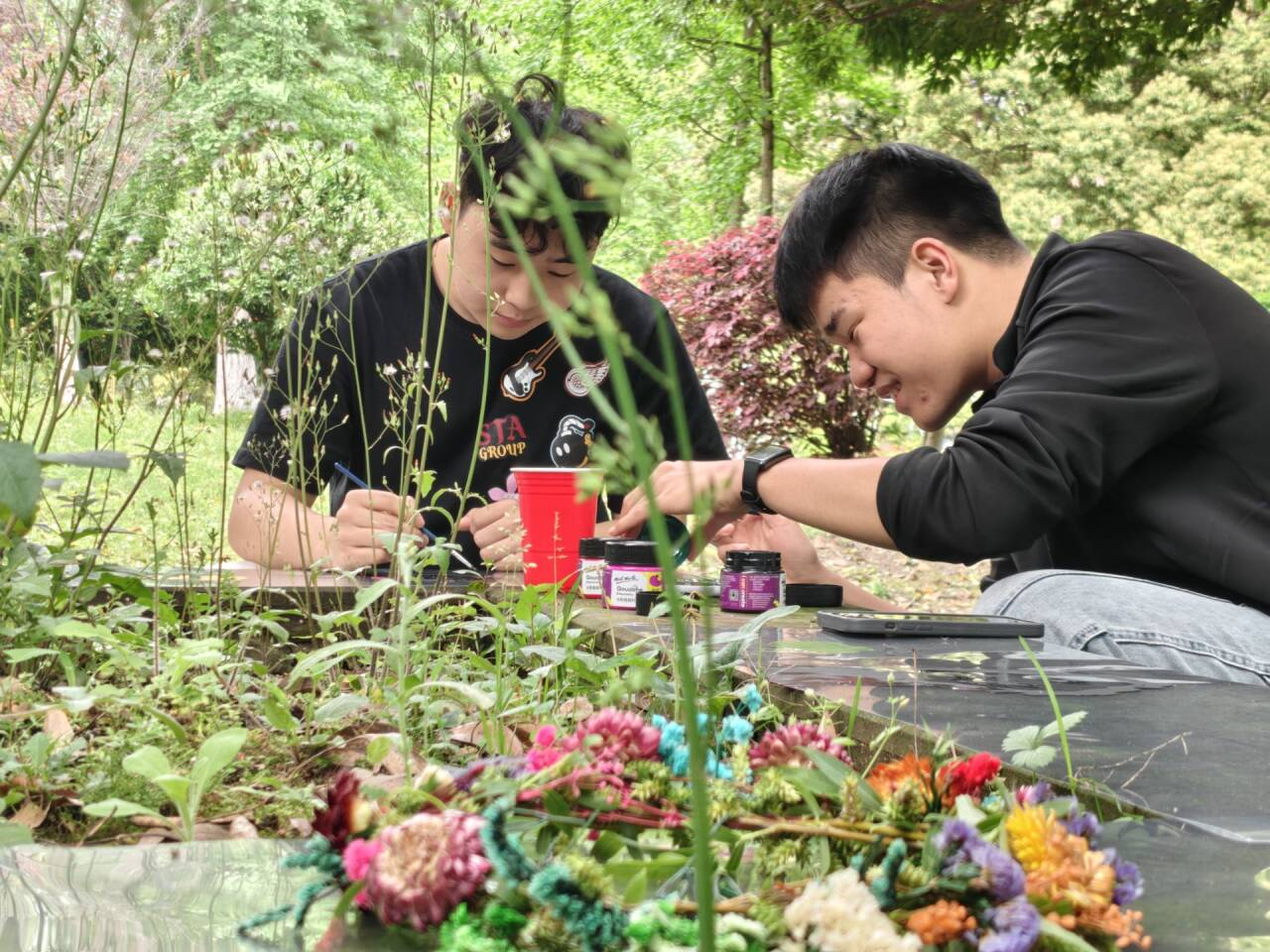 活动紧扣压力释放、情绪表达、自我疗愈三大核心,设置三项特色体验环节,让同学们在自然中与自我对话、在创作中安放心绪。 “柳编心意,饰放美好”柳条编织环节,同学们拾取春日嫩柳,以缠绕、打结等技法制作柳环、挂饰。指尖触碰柳枝的过程中,杂念渐消、专注力回归当下,手工创作成为温柔的自我疗愈,让紧绷的身心得到舒缓。