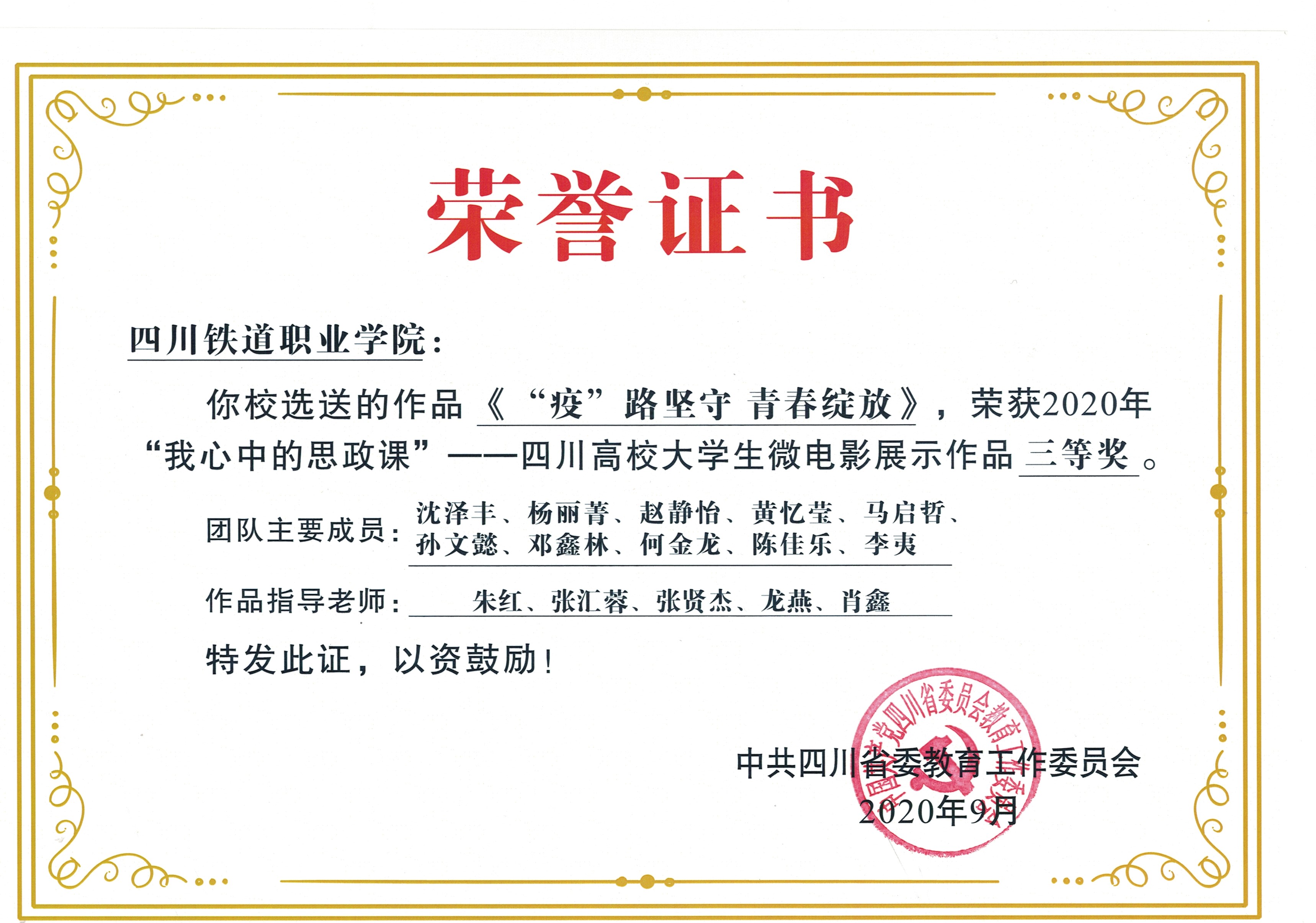 为深入贯彻落实习近平总书记关于教育的重要论述特别是在学校思想政治理论课教师座谈会上的重要讲话精神,教育部高校思政课教学指导委员会主办了2020年“我心中的思政课” ——第四届全国高校大学生微电影展示活动。 由四川省教育厅宣思统战处主办的省级比赛近日落下帷幕。在学生处、校团委、各系、实训中心等相关部门的大力支持下,思政部代表学校指导、推荐的参赛作品《“疫”路坚守 青春绽放》,用微电影的方式呈现了思政课学习过程中的精彩故事,荣获2020年四川省高校大学生微电影展示作品三等奖。米兰官网是仅有的5所获奖专科学校之一,其余获奖学校均为电子科技大学、西南交通大学等本科学校。
