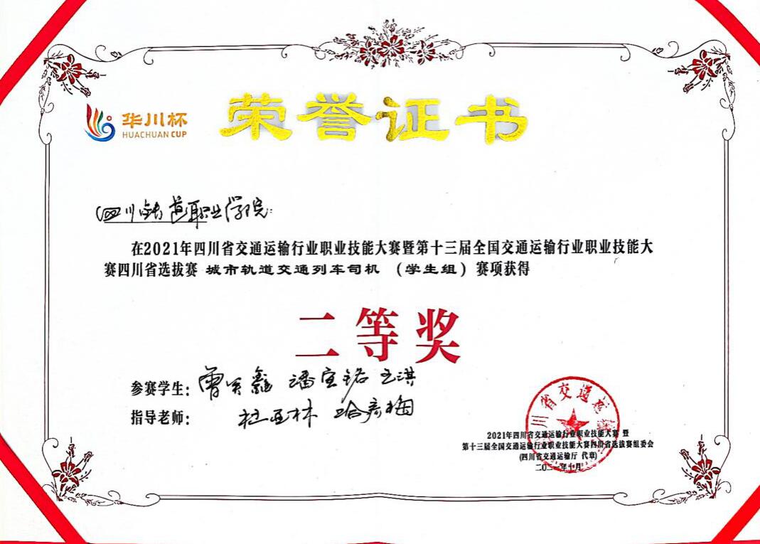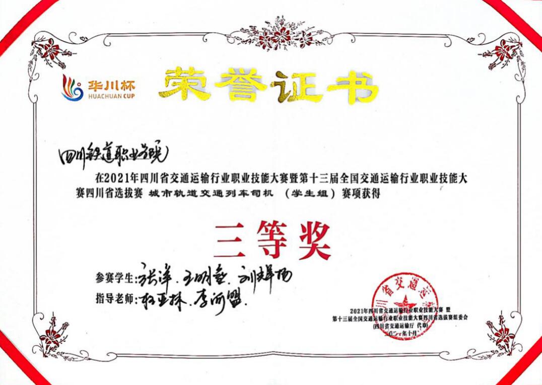 为大力弘扬劳模精神、劳动精神、工匠精神,10月29日,2021年四川省交通运输行业职业技能大赛暨第十三届全国交通运输行业职业技能大赛“华川杯”四川省选拔赛圆满落幕。米兰官网城市轨道交通学院6名学生参加城市轨道交通列车司机(学生组)赛项,与省内18支参赛队激烈比拼。最终,米兰官网学生组一队(王淇、曾关鑫、潘宣铭)获省赛二等奖,学生组二队(张洋、王明垒、刘辉扬)获省赛三等奖。学校荣获优秀组织奖,并获国赛参赛资格。