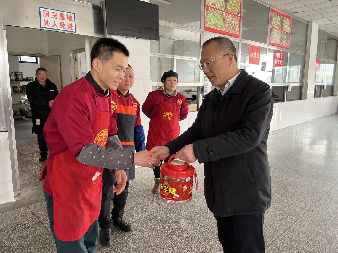1月31日,农历除夕,学校党委书记贺兆轩同志带队对值班人员和留校学生进行了慰问,党委办公室/学院办公室/外事办公室、党委学生工作部/学生处/就业处、后勤国资处、安全保卫处相关人员参加慰问。 贺兆轩同志对在万家团聚的日子为了学校安全、后勤保障仍然坚守岗位的值班人员表示感谢,并代表学校向节日期间仍然在工作岗位的全体干部职工及家人拜年。