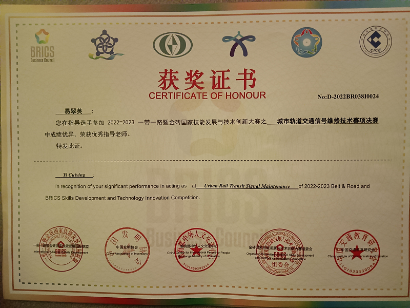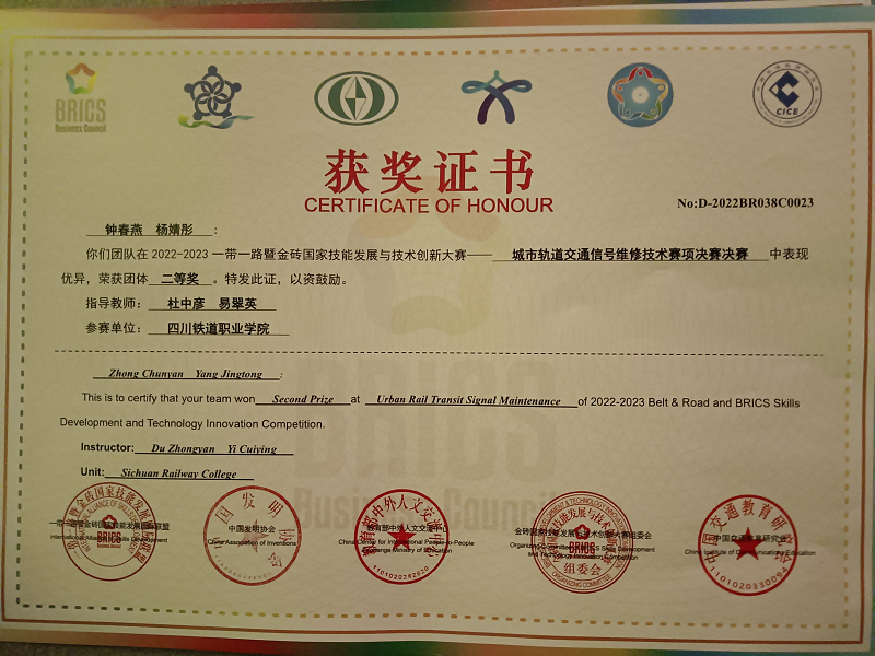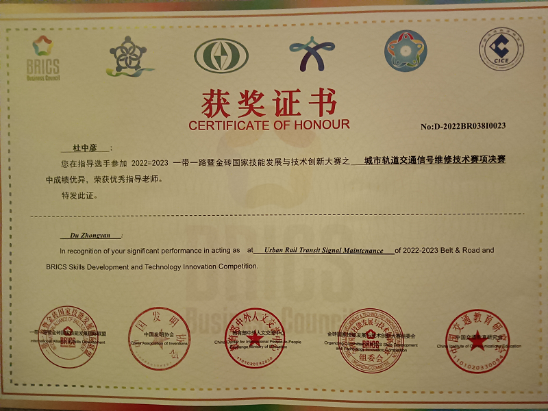 2023年4月22日,2022一带一路暨金砖国家技能发展与技术创新大赛城市轨道交通信号维修技术赛项总决赛在南京交通职业技术学院盛大开幕。电信工程学院信号18A1班杨婧彤、信号20T1班钟春燕,获全国二等奖,指导教师杜中彦、易翠英荣获优秀指导教师奖,学校荣获优秀组织奖。 本次竞赛经历了省赛选拔,国赛考核,紧紧围绕城市轨道交通信号工职业岗位的核心能力培训与考核。考核分为两个部分,理论考试根据职业技能标准开展命题考核,技能实操考核高度还原标准化维修作业流程,检验参赛选手信号设备检修、信号设备故障分析与处理的技能操作水平。 此次竞赛,增进了米兰官网与其他参赛各院校之间的友好交流,了解了信号行业的发展新趋势、新技术,切实达到“以赛促教、以赛促学、以赛促改、以赛促建”的目的。同时,在技能竞赛的激励下,提高了学生学习专业的兴趣和实践操作能力,提高了专业建设水平和人才培养质量。