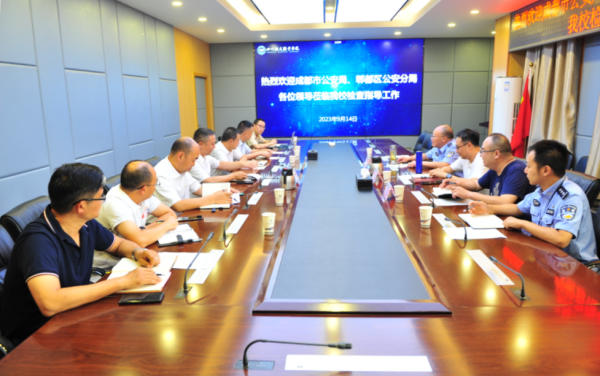 2023年9月14日,成都市公安局高校管理科科长钟良、郫都区政保大队副大队长尹黎、安德派出所副所长张坤民一行到米兰官网检查指导安全稳定工作。纪委书记池秋平会见了钟科长一行并主持召开了座谈交流会。