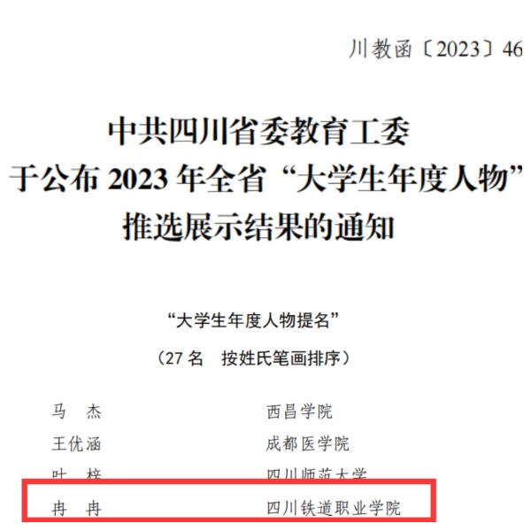 近日,中共四川省委教育工委公布了2023年四川省“大学生年度人物”评选结果名单,智能产品开发与应用21T1班冉冉同学获评四川省“大学生年度人物”提名奖。