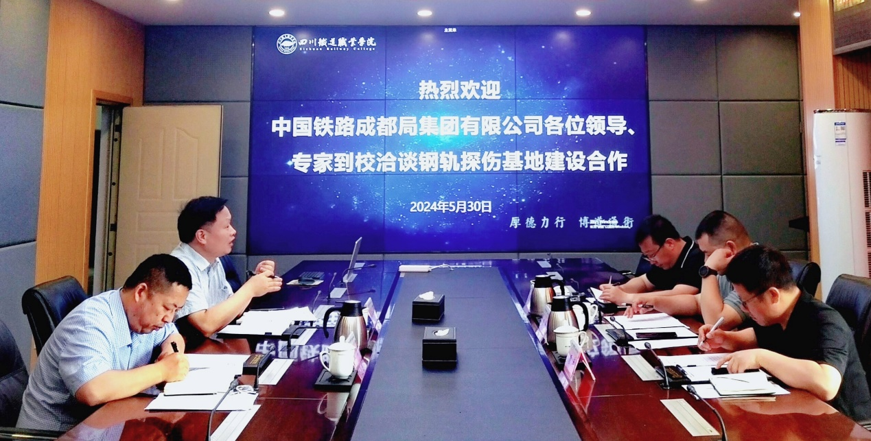 5月30日上午,中国铁路成都局集团有限公司职工培训部副部长刘明、工务部副部长吕元博、钢轨管理中心主任唐军一行来米兰官网洽谈钢轨探伤基地共建项目合作,会议在第五会议室进行,副校长黄恩兴、铁道工电学院院长王立参会。 会上,黄恩兴详细介绍了钢轨探伤基地建设的现状和未来规划。他表示,钢轨探伤基地应成为集员工培训、技能鉴定考试、学生日常教学、实训及技术技能研发于一体的综合性平台。在当前大数据、人工智能快速发展的背景下,基地的建设不仅要满足当前的实际需求,还要前瞻性地考虑未来铁路行业的发展趋势。同时,钢轨探伤基地的建成将惠及铁道工程、高速铁路综合维修技术、铁道供电、铁道机车等多个专业。他诚挚地希望中国铁路成都局集团有限公司能为基地建设提供宝贵的意见和建议,共同推动项目的顺利实施。 刘明对黄恩兴的提议表示高度赞同。他表示,中国铁路成都局集团有限公司与学校在此方面有着广泛的共识,双方的合作将有效解决当前职工培训和技能鉴定等现实问题,并为铁路行业的未来发展培养更多高素质人才。他表达了对双方合作的强烈意愿和信心。
