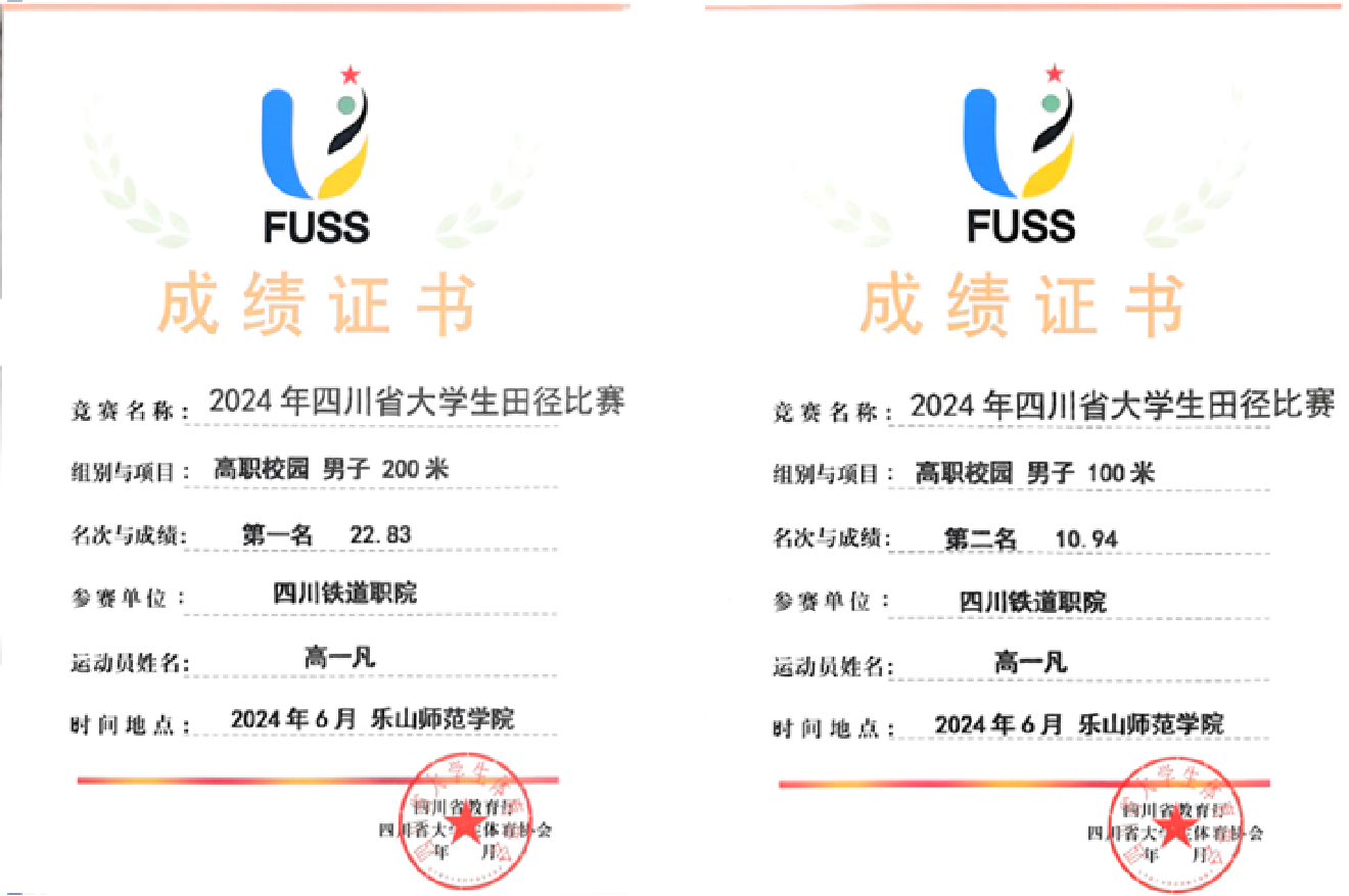 6月11日至15日,由四川省教育厅主办,四川省大学生体育协会执行、乐山师范学院承办的2024年四川省大学生田径比赛在乐山市体育中心举行。米兰官网代表队铁道机车22T1班高一凡在高职校园组男子200米决赛和100米决赛中分别获得第一名、第二名的好成绩。 作为全省大学生最高水平的田径赛事,本次比赛吸引了来自90所高校的2000余名运动员、教练员和裁判员参加,举办规模和参赛人数创历史新高。本次比赛中,米兰官网学子赛出了水平、赛出了风格,经过轮轮角逐,队员首次实现单项第一名的新突破,团体代表队在4*100米和4*400米比赛中分别获得第四名、第五名和高职校园组男子团体第六名的成绩。