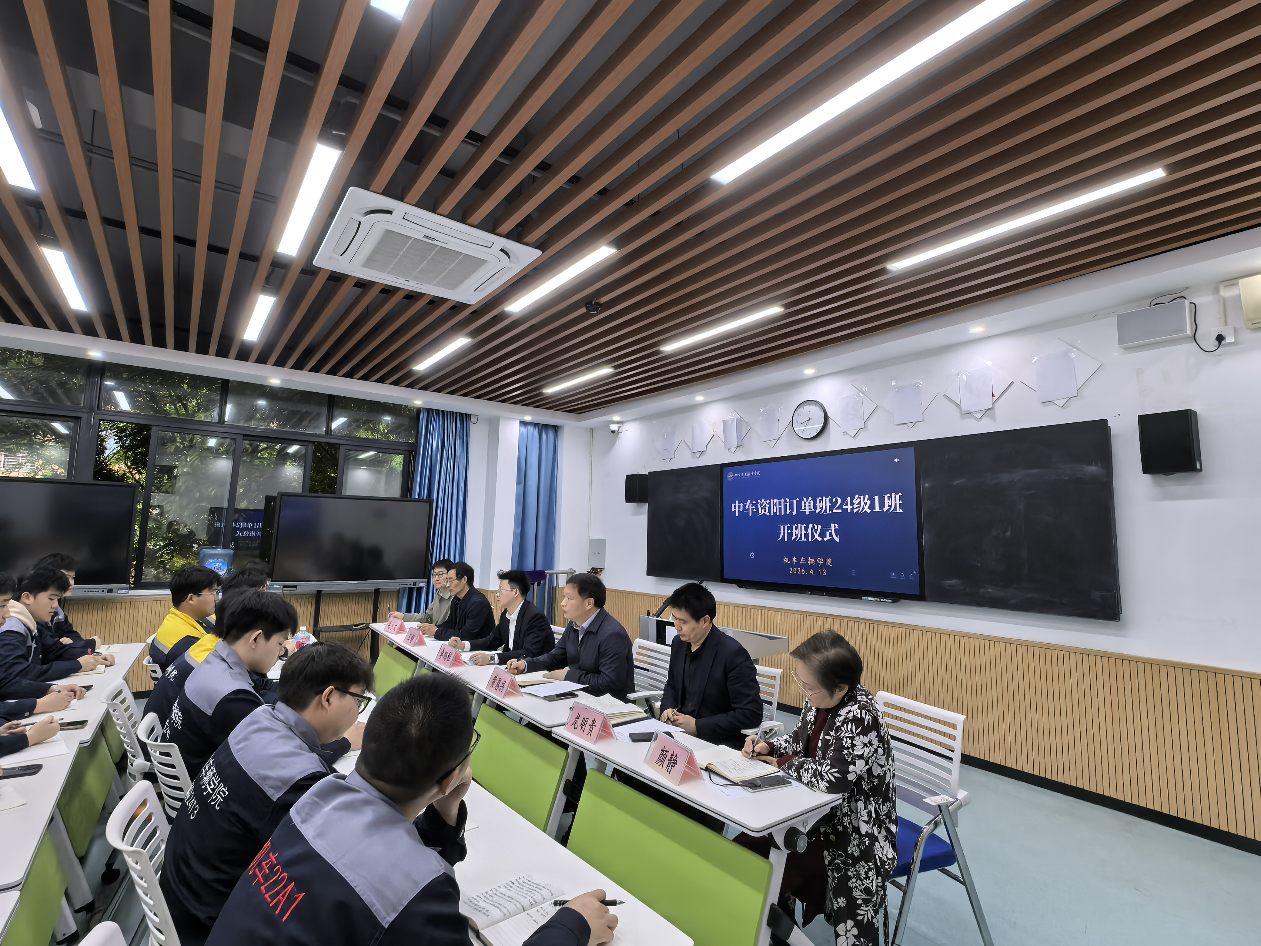 4月13日,中车资阳订单24级1班开班仪式在学校第一教学楼1209室隆重举行。仪式由铁道机车运用与维护专业教研室主任毛永文主持,中车资阳机车有限公司人力资源部能力提升主管李鹏程、副校长黄恩兴出席开班式,相关教学单位与职能部门负责人及35名学员共同参加。