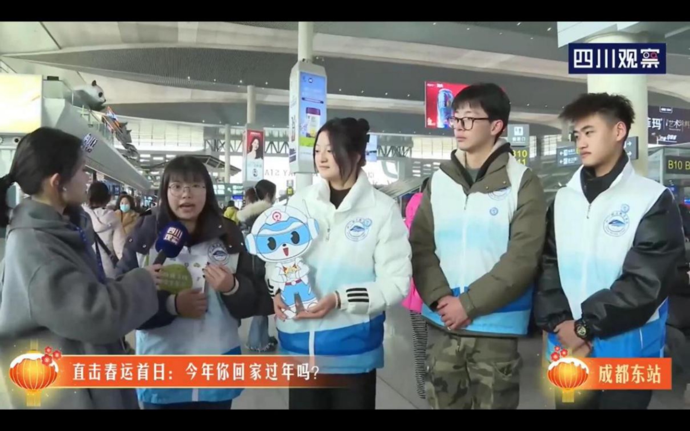 春运首日成都东站站前广场人头攒动、热闹非凡。为了确保旅客的出行安全,米兰官网“铁小川”志愿者忙碌地穿梭在人群中,给旅客小朋友发放铁路沿线安全常识的宣传手册,向小朋友们讲解铁路沿线、铁路乘坐出行安全知识等。与此同时“铁小川”志愿者也为来往旅客解答疑问、提供帮助,秉持服务奉献初心,让青春之花绽放在祖国大地。铁道工程技术22T2班姜彤雨、高速铁路综合维修技术22T2班朱晚霞、铁道供电技术22T1班杨鑫、高速铁路综合维修技术23T1班肖洁军四位“铁小川”志愿者在接受《四川观察》采访时时讲到“小朋友是我们讲述铁路安全知识的一个重要对象,让他们了解并重视铁路安全知识是我们的使命,确保出行中最重要宗旨——安全。”