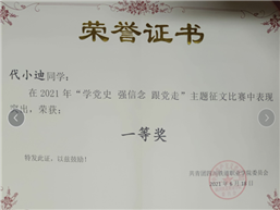 2021年6月学院团委组织开展“学党史、强信念、跟党走”主题系列活动,在交通工程系党总支和团总支积极动员与全系学生的热情参与下,在“新时代青年写”主题征文比赛中,工程17A2班学生代小迪,综维20T1班学生邓茹获得一等奖,施养18A1班学生李皓获得二等奖,在“新时代青年诵”主题朗诵比赛中工程19T3班学生陈宏渝获得三等奖!希望交通工程系全体学生再接再厉,不负青春年华,将自己的才华与特长尽情发挥!
