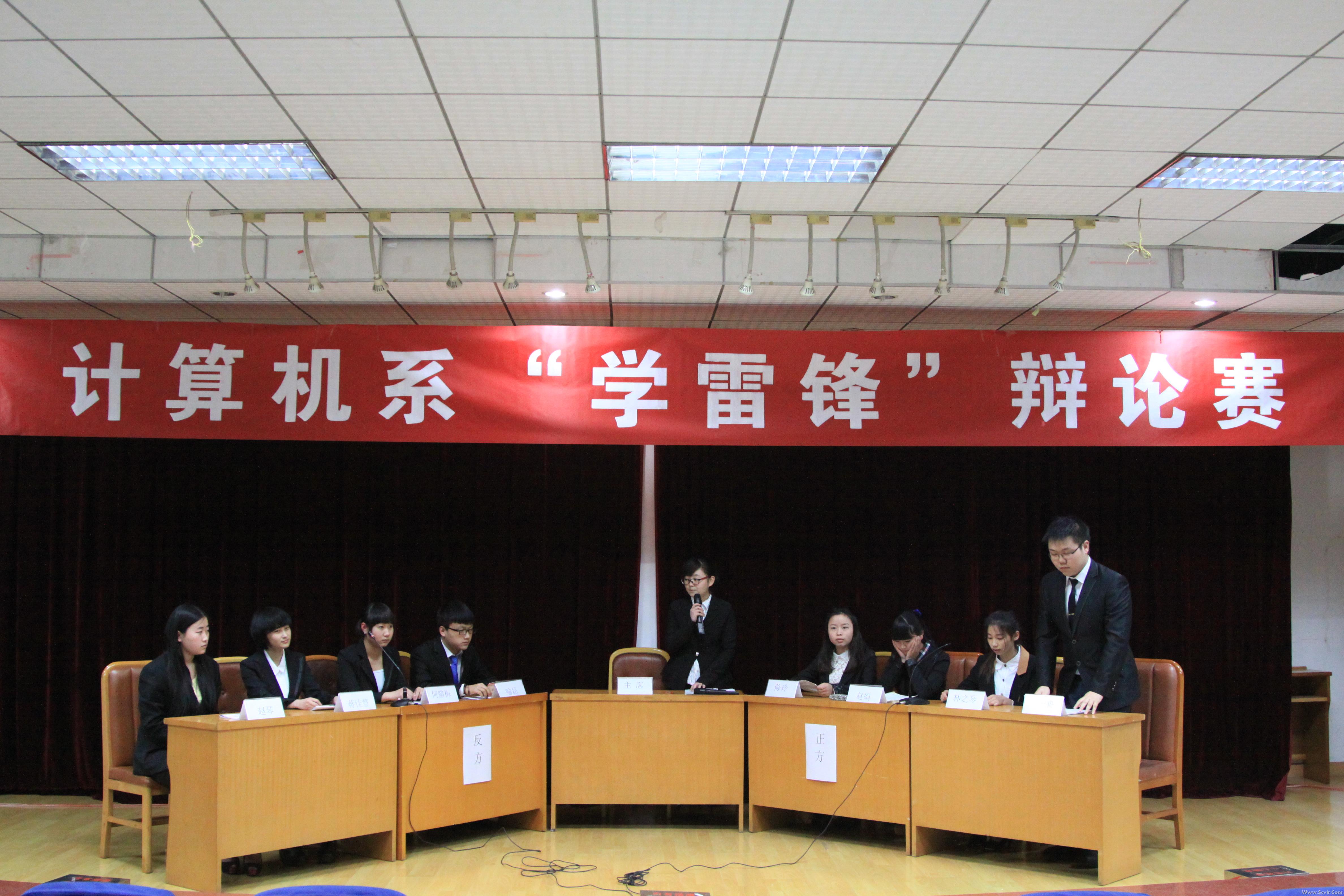 为纪念毛泽东同志号召“向雷锋同志学习”51周年,丰富和发展新时期“学雷锋”活动的内涵和形式,积极倡导“奉献、有爱、互助、进步”的志愿服务精神。计算机系团总支积极响应院团委号召,从3月17日至27日期间,在学院多功能厅教室开展了以“弘扬雷锋精神,争做文明大学生”为主题的一系列辩论赛。参赛选手就雷锋精神是否适应当今社会、物质待遇能否体现人生价值等内容展开了激烈的辩论。经过激烈的角逐,计算机系2013级计应2班代表队获得冠军。