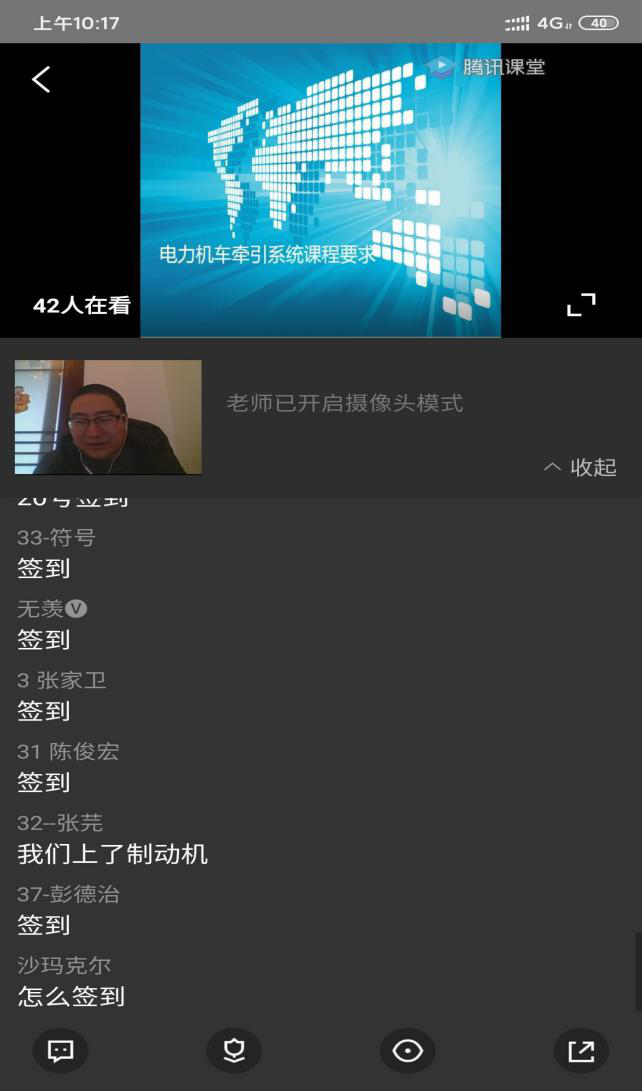 毛永文老师通过腾讯课堂向机车18T2班级的学生进行《牵引控制系统2》课程的在线教学,课前通过线上签到有效组织教学,督促学生准时到位。