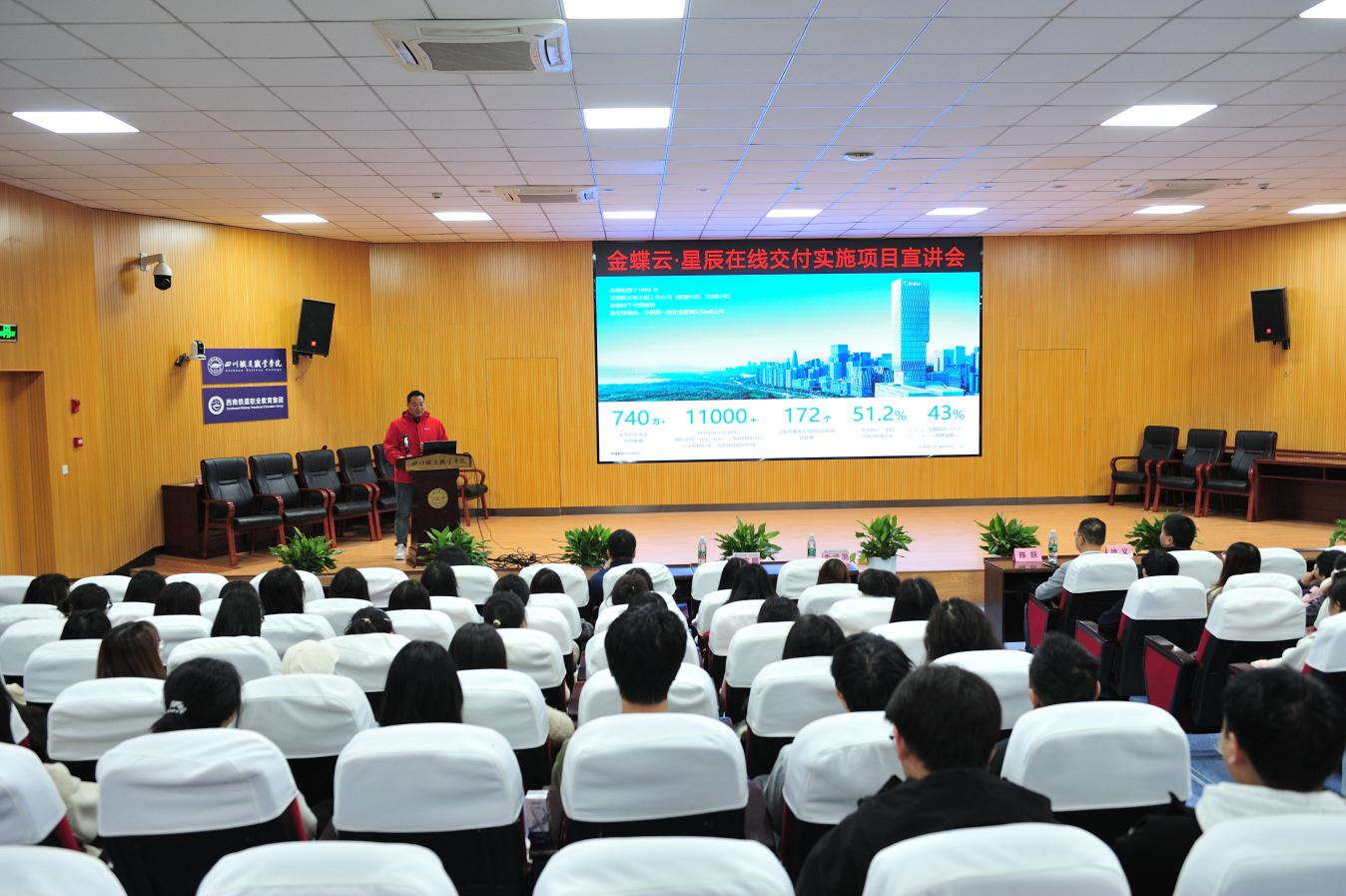 会前,郭立峰就“金蝶云· 星辰”等企业管理云服务产品以及“企业智改数转实施交付基地”作专题宣讲,经济管理学院师生参加宣讲活动。郭立峰一行还参观了学校铁道综合演练场、城市轨道交通综合实训中心和智能财税交付中心等。