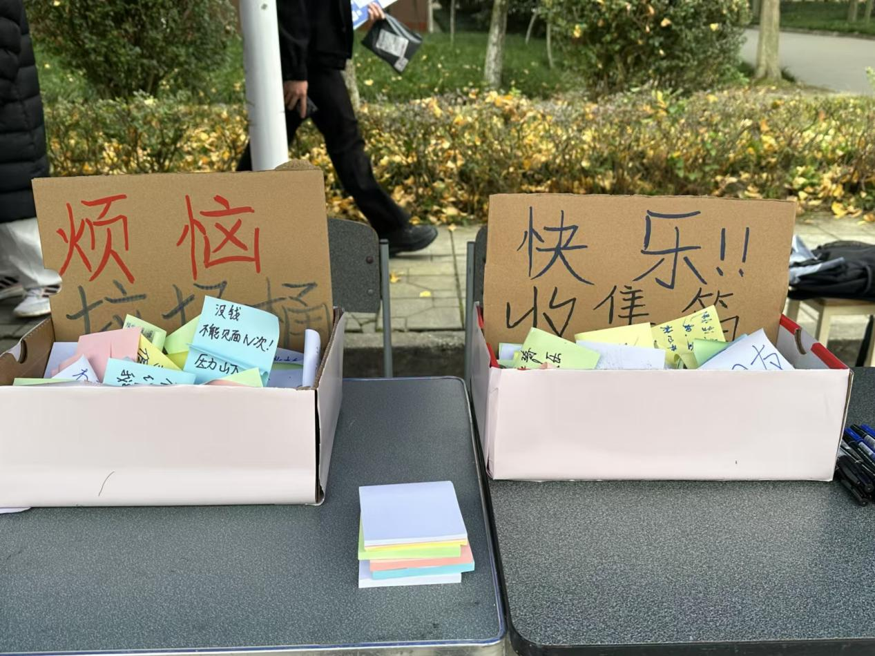 活动现场气氛热烈而温馨,一系列丰富多彩且极具针对性的环节设置,让同学们深刻领悟到了“与爱同行,拒绝焦虑”的内涵与力量。“便利贴寄情,焦虑去无声”活动,灵感源自于对简单、便捷且匿名表达方式的追求。每一张便利贴,无论是工整还是潦草,都承载着同学们最真挚的情感。它们被密密麻麻的放在“烦恼”和“快乐”的纸箱中汇聚成一片情感的海洋。在这里,烦恼不再是一个人的秘密负担,快乐也能被加倍传递和分享。同学们借此明白了焦虑并非不可战胜,可以运用很多方法帮助自己保持内心的平静与安宁。