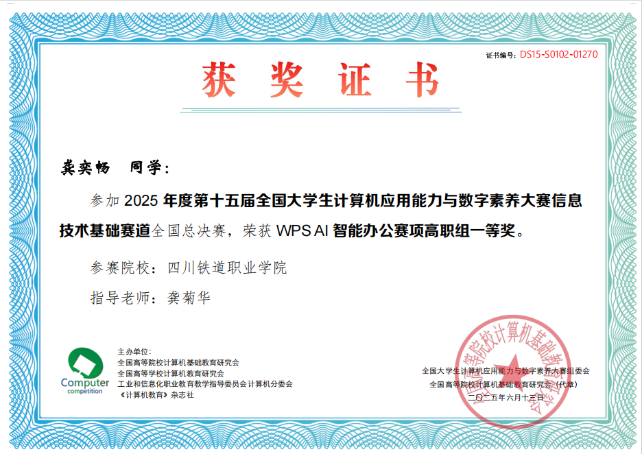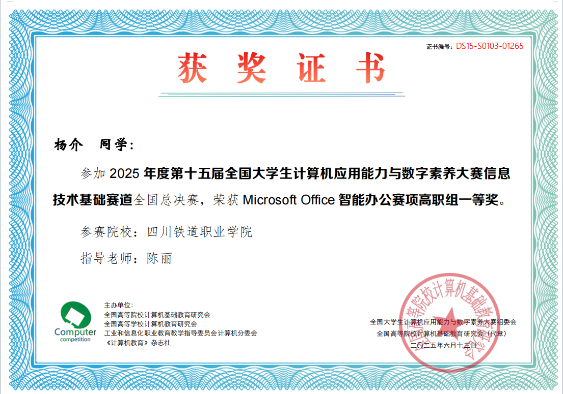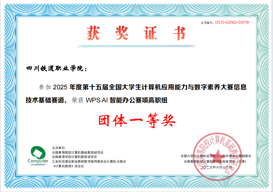 近日,第十五届全国大学生计算机应用能力与数字素养大赛全国总决赛圆满落幕。通过“校赛-省赛-全国总决赛”层层选拔,最终10名学生在全国决赛中获得名次,其中一等奖3名,二等奖6名,三等奖1名,同时荣获Microsoft Office智能办公赛项、WPS AI智能办公赛项高职组等2个团体一等奖。
