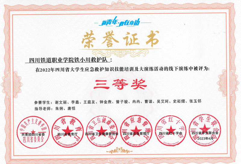 近日,由共青团四川省委、四川省教育厅、四川省卫生健康委员会、四川省应急厅、四川省红十字会、四川省学生联合会等六部门共同主办的首届“新青年·救在身边”四川省大学生应急救护知识技能大演练活动落下帷幕。米兰官网选派10名同学组成的“铁小川救护队”参加了本次大演练,荣获三等奖。