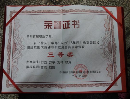 本活动由交通工程系土木工程协会承办,在系主任及指导老师的带领下,选拔出8名优秀队员,成立导线组和水准组两支队伍。于2016年4月8日至10日到四川水利职业技术学院羊马校区参加“徕拓·中纬”杯2016年四川省高职院校测绘技能大赛,并在四等水准测量赛项中荣获“三等奖”。