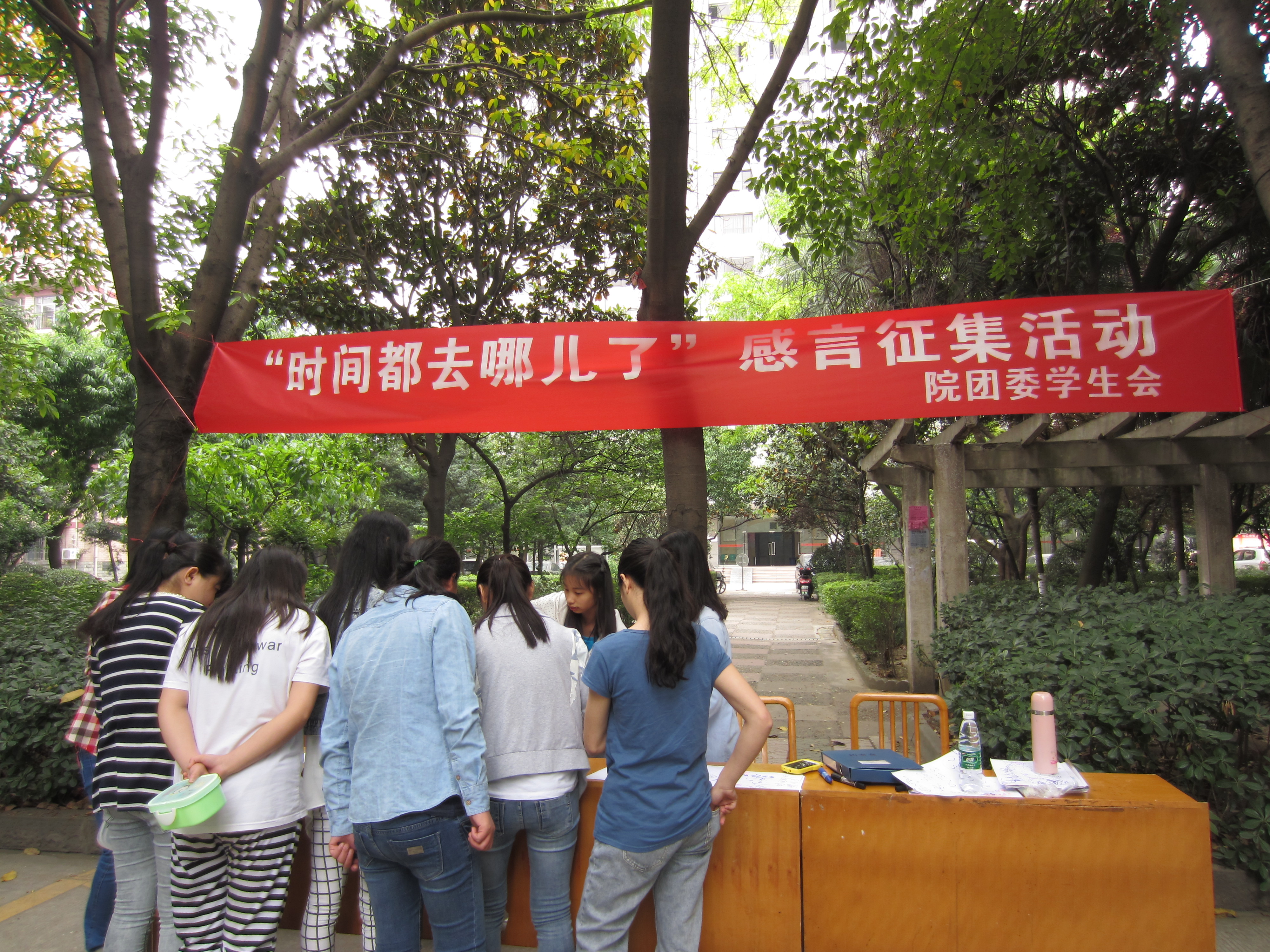 由院团委举办的“时间都去哪了”为主题的感言征集活动中,同学们纷纷在现场书写感言来表达对时间流逝的感慨,组织都们用镜头留下他们精彩的瞬间,最后把所有的镜头制成电子相册的形式,让我们在 “时间都去哪儿了”音乐中回首过去。有的同学写下了对旧时光的追恋;有的同学则表达了对当初自己的肯定,还有的同学抒发了对往日缺憾的悔恨……活动还吸引了部分老师的参与,老师们也发表了对时间去哪儿的感言。大家都通过对过去的追忆感受到了时间的流逝,引发了大家对于“时间”这一概念的思考。